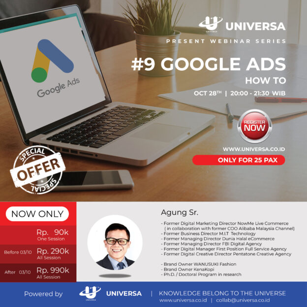 Dalam course ini, anda akan mendapatkan jawaban dari pertanyaan seputar google ads, bagaimana memasang iklan di portal ternama seperti detik, kompas, tribunnews, dan lainnya dengan budget minim. Anda juga akan mahir dalam membuat dan mengaplikasikan google ads untuk mengembangkan bisnis yang anda miliki.